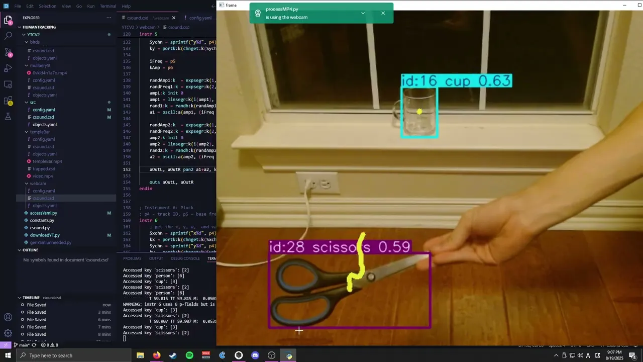 VideoCsound utilizes a modular Python pipeline to synchronize high-speed object detection with real-time audio synthesis. OpenCV handles the video stream, while Ultralytics YOLO extracts bounding box coordinates and unique track IDs.